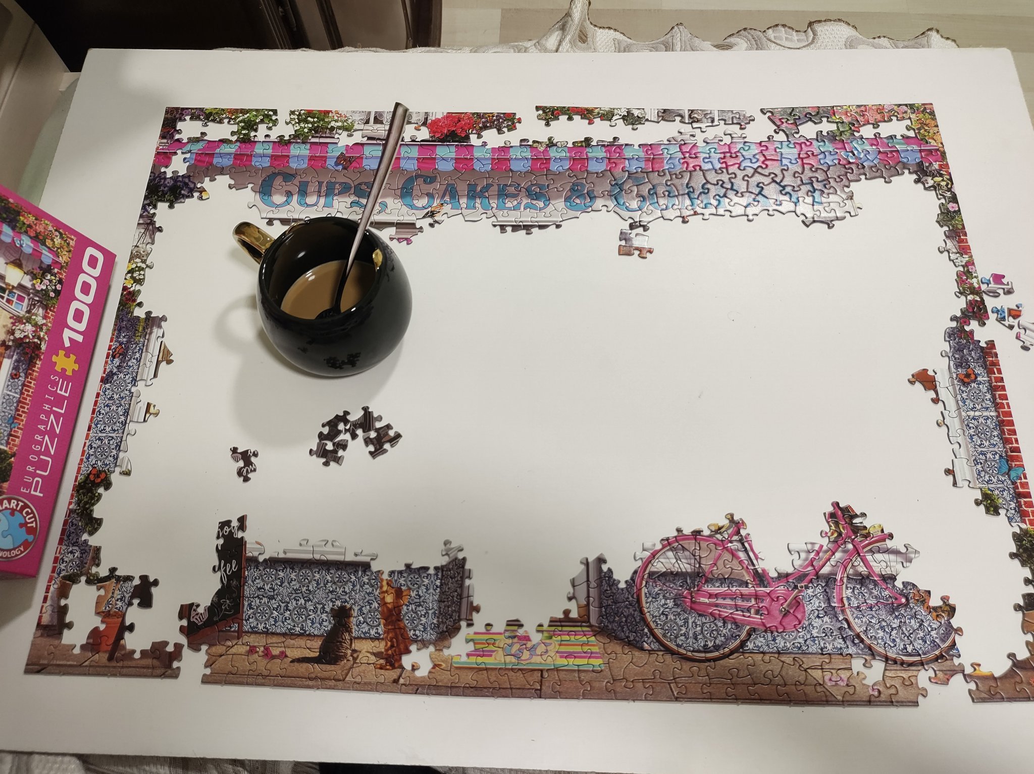 Той пътуващия е нареден вече. Тази нощ го оправих... Без рамката, която услужливо е отделена и долния десен ъгъл, който си заплю детето. Вчера бяха много щастливи да ми помогнат да донеса и двете пратки у дома. Падна ми батерията на телефона и не можах да снимам блясъка в очите на децата, че ще редим пъзел.
