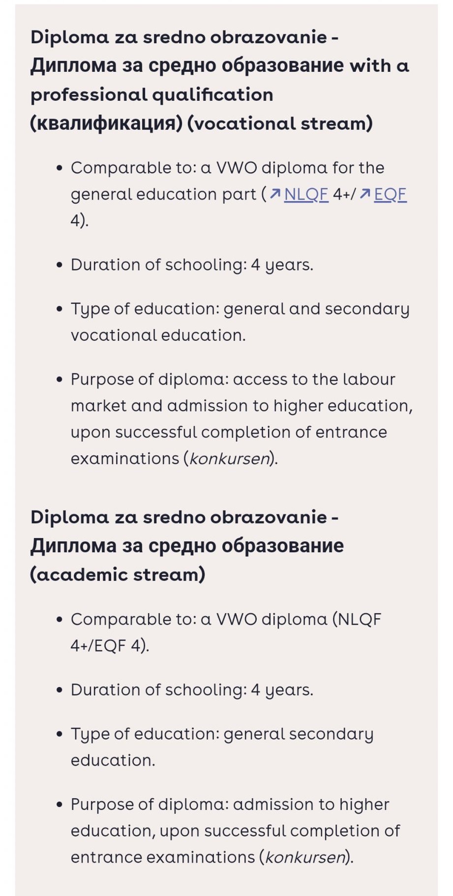 Ето една специалност, избрах на посоки някаква  хуманитарна, приемат в нея и от професионални гимназии. Апропо, холандската диплома от техните професионални гимназии си важи без никакви проблеми за техните приложни унита, но не само, за академичните също. А българската диплома за средно образование, каквато получават и от професионалните гимназии се приравнява към тяхната vwo. Това, че някои ТУ държат на математика, физика, а други на химия и биология, не е изненада и което дете не ги е учило профилирано, ще има затворена врата, било то от ЕГ или професионална гимназия. Тези ТУ си пишат academic stream  предварително, но после си търсят хорариума мат и физика дори в него.