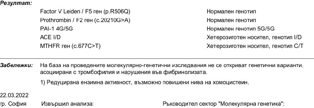 Генетичните изследвания за тромбофилия включват фактори като Фактор V Лайден, Фактор II Протромбин, Plasminoген Activator Inhibitor и Метилентетрахидрофолат редуктаза. Допълнителни фактори, изследвани в генетични тестове, включват Angiotensin I-Converting Enzyme, Methioniine synthasе reducetase, Vascular endotheliaл growth factor A и Procarboxypeptidasе U. Тези изследвания са важни за оценка на риска от тромбози и други сърдечно-съдови проблеми.