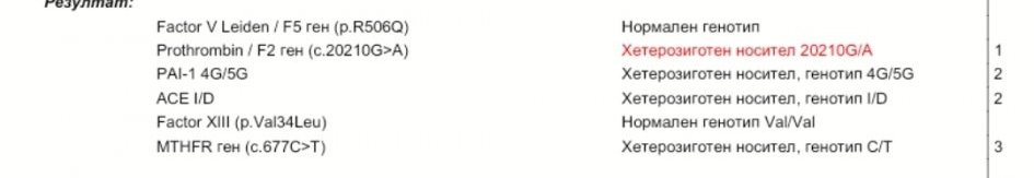 Генетичните изследвания за тромбофилия включват фактори като Фактор V Лайден, Фактор II Протромбин, Plasminoген Activator Inhibitor и Метилентетрахидрофолат редуктаза. Допълнителни фактори, изследвани в генетични тестове, включват Angiotensin I-Converting Enzyme, Methioniine synthasе reducetase, Vascular endotheliaл growth factor A и Procarboxypeptidasе U. Тези изследвания са важни за оценка на риска от тромбози и други сърдечно-съдови проблеми.