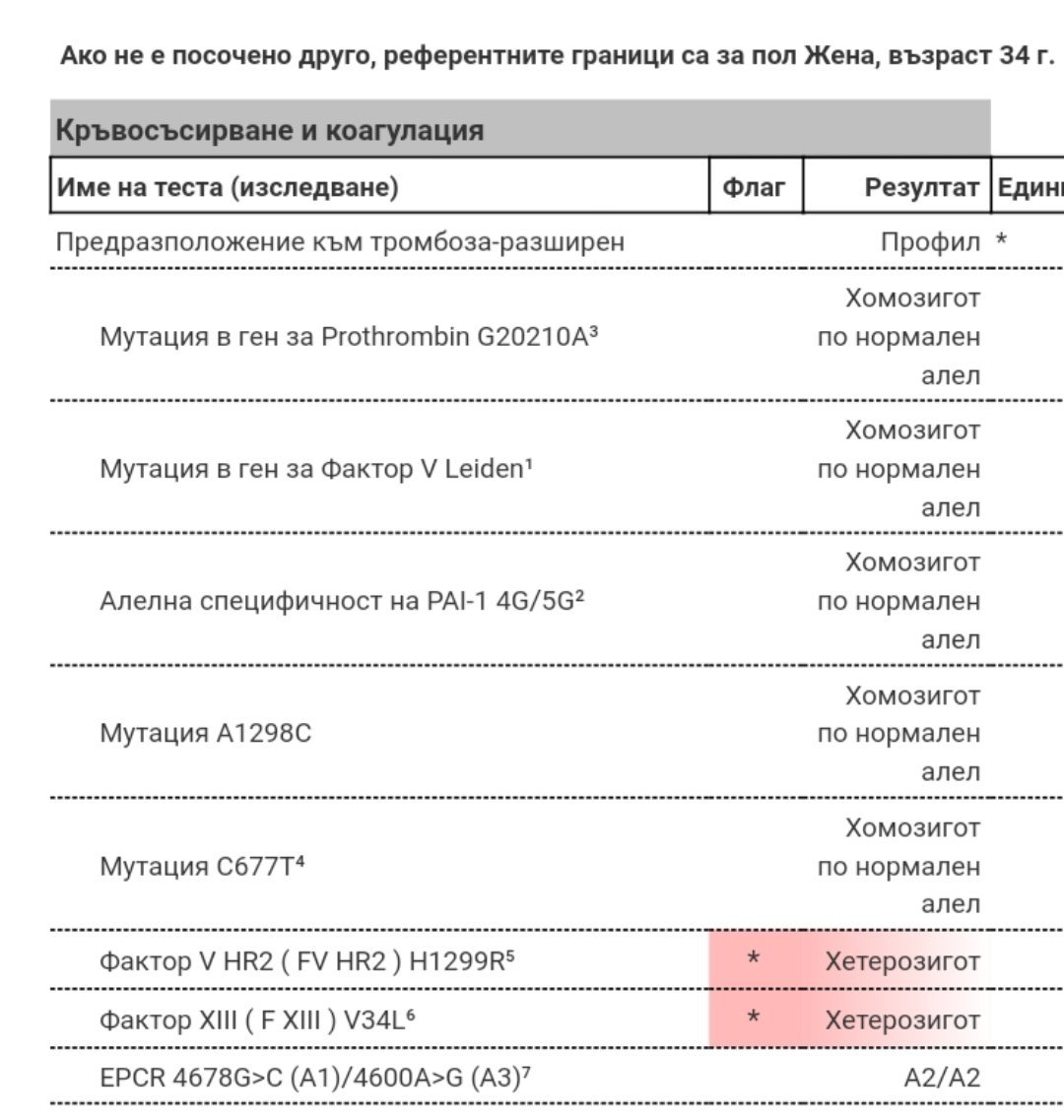 Генетичните изследвания за тромбофилия включват фактори като Фактор V Лайден, Фактор II Протромбин, Plasminoген Activator Inhibitor и Метилентетрахидрофолат редуктаза. Допълнителни фактори, изследвани в генетични тестове, включват Angiotensin I-Converting Enzyme, Methioniine synthasе reducetase, Vascular endotheliaл growth factor A и Procarboxypeptidasе U. Тези изследвания са важни за оценка на риска от тромбози и други сърдечно-съдови проблеми.