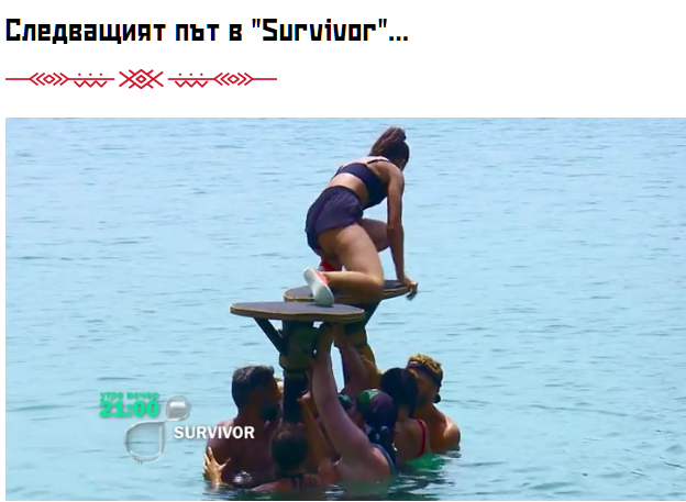 Иначе като цяло, готин епизод. Не очаквах наистина Ифугао да победят, те пък взеха, та ме опровергаха. Блестящ Драго, но това няма да го спаси. Щом и невинната, пардон, "невинната" Мила отсече, че следващия ще е той.....май не ѝ се получава театрото вече на милата Мила. А всъщност Драго може да им е по-цЕнен от Ивайло, чисто физически за игрите, защо са се лепнали за тоя хърбалет не разбирам. В това племе женската коалиция е бетон, Джулия/ана във всеки момент може да я придърпат и нея, въпреки, че е самосиндикална донякъде /когато ѝ изнася/, а и е против футболистчето, но ако им е нужна, ще я обработят със сигурност.