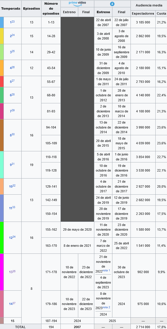 До 8-ми сезон са поддържали висок рейтинг и гледаемост, след това постепенно пада и последните два сезона драстично намалява.