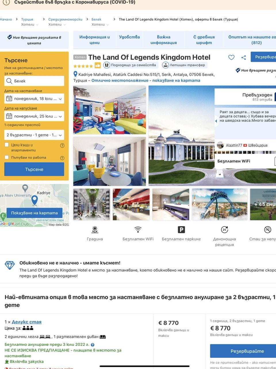 Ако става дума за хотела в Белек ще излезе, че в България подаряват. За средата на юли десет нощувки за двама  в The Land of Legends струват 20 000 лева.