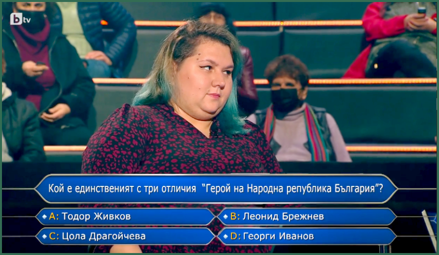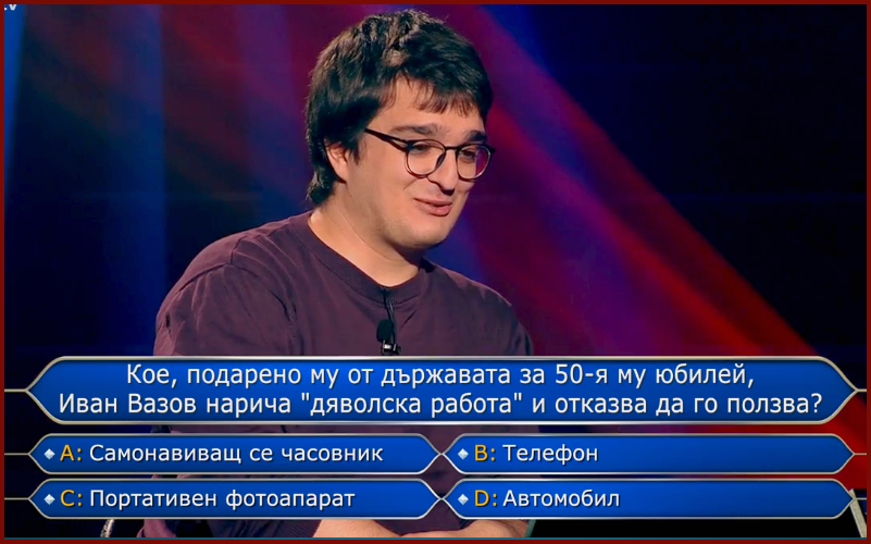 В музея на Иван Вазов са ни водили като ученици, но никога не бих си спомнила имало ли е телефон или не. Много са идиотски тия въпроси, които аз наричам статистически - за наградите на Брежнев. Това е много малко вероятно да го знаеш отнякъде, дори и да си го чул във времето, едва ли ще го запомниш. Освен това по никакъв начин не можеш да го установиш със разсъждения. Тя правилно изключи космонавта, но поне Тодор Живков и Брежнев бяха с равни шансове за мен. Също започвам да мисля, че реално не отговаря публиката, а организаторите на предаването. Едва ли публиката го знае с такава категоричност.
