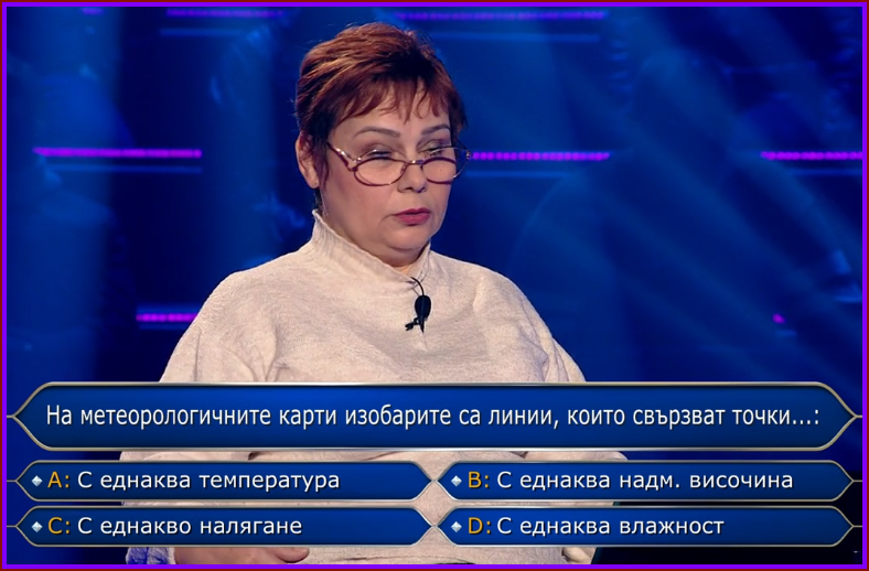Продължавайте да упорствате. Мен няколко пъти ме спираше на 10 000 или на 20 000 лева, а най-дразнещо е да дадеш отговор на 15-ия въпрос и системата да не ти го отразява - само отчита времето и накрая виждаш съобщение, че времето ти е изтекло. Все пак, успях 3 - 4 пъти да "спечеля" 100 000 лева. Повече не играя, не ми е интересно.