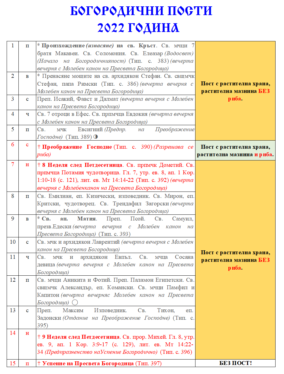 Когато има света литургия. Другата събота например е Преображение Господне и ще има литургия. А в понеделник почват Богородичните пости.