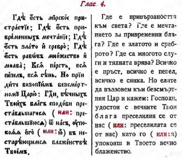 Искам да попитам знаещите. На задушница всеки път се чете един текст (нямам идея какво е точно, но не е от Библията или Евангелието), в който се говори за състоянието на душата след смъртта. По спомен цитирам неточни отрязъци: "о, как самотна е тя сега, о как ръце протяга", "къде са сега слугите с тяхната глъч/суета...", "всичко е прах и пепел". Питах отчето, той ми каза, че е от молитвеника, но не съм сигурна, че разбра за какво точно му говоря, а аз в молитвеника не го откривам.