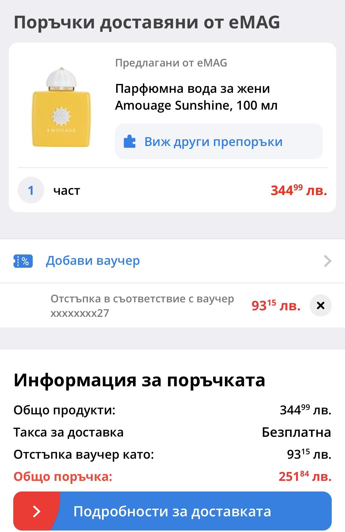Емаг много странно реагират. Преди няколко дни реших да си купя някаква Арабела от тях, никога не съм ползвала арабски парфюм и ми е интересно. Реших да се възползвам, че плащам доставка и си добавих един ароматизатор за пране и половин кг кафе. Веднага ми изписа, че ме прехвърлят и доставката ми е 11 лв. Естествено, че няма да приема такъв пладнешки грабеж и се отказах от поръчката.