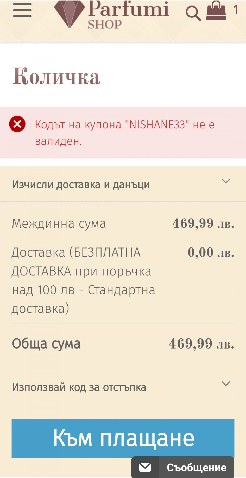 А защо при мен изписва, че кодът е невалиден, при това с парфюм точно на Нишан в кошницата? Копи-пействах, изписвах - никак не става.