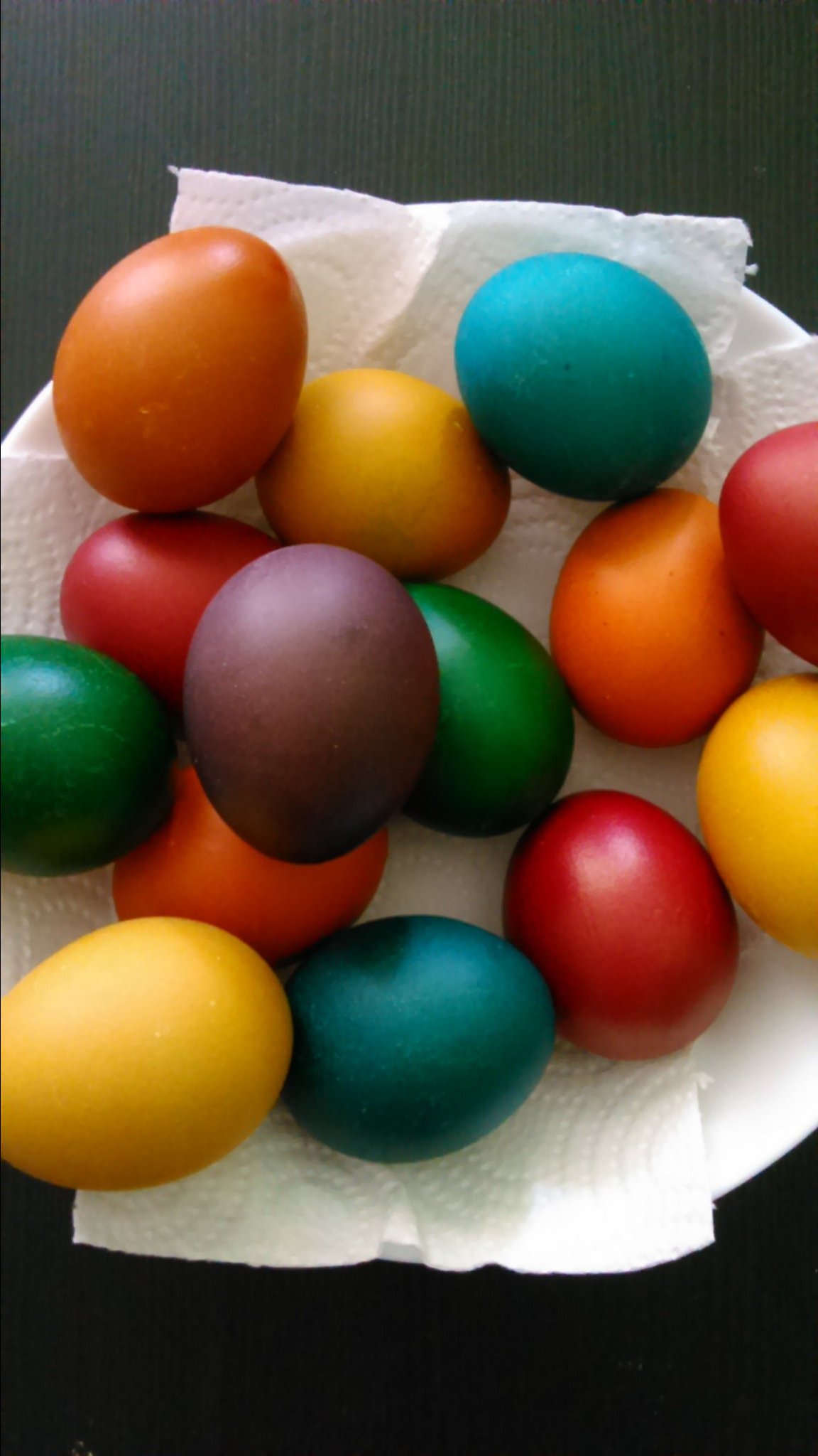 Боя за яйца ползвам от техните бг капсули, на Метма са, но по-евтини. Слагам по две от цвят, без лилавото, че става много тъмно. Идеално се получават цветовете, дори да не са бели яйцата, просто за жълтото избирам някое по-светло.