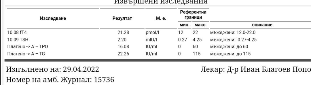 Здравейте на всички, вчера бях на ендокринолога, с хиповункция съм по принцип, пия Елтирокс ин по 50 мг всеки ден. Отидох, защото имам някакви симптоми и търся причината,. От два месеца започна да ми трепери лявата ръка, сега от време на време и дясната, имам и вътрешно треперене на цялото тяло понякога. Болки в мускулите от време на време, тревожност. Това започна след прекаран Ковид. Бях и на невролог, изписа ми грандаксин, от нервите било уж това треперене, но на мен някак си не ми се вярва. Пуснах си и няколко изследвания, ако някой разбира може ли да ги погледни. По принцип съм и със инсулинова резистентност, но съм на хранителен режим вече почти 11 месеца, свалила съм 20 килограма от 78 сега съм 57. За сега не пия хапчета за нея, но може и диабет да имам, ще се изследва след седмица за да видим какво се случва. Ще прикача изследванията, ако някой види нещо, което може да ми помогни, ще съм ви благодарна. Да ви кажа от форума научавам много повече информация, отколкото от докторите. Благодаря ви предварително и извинете за дългият пост.