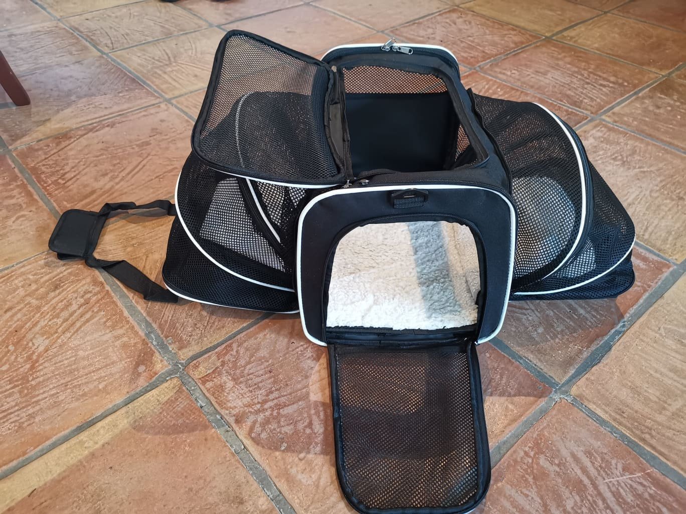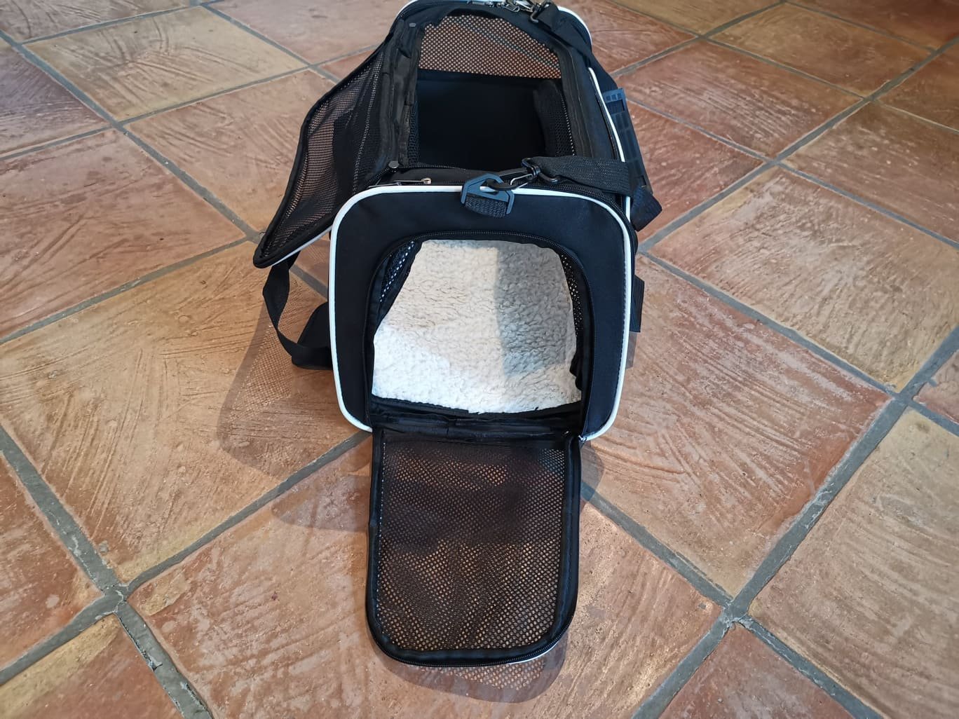 Не знам дали имате предвид транспортната чанта, която купих за кабината на самолета за Васко. Тя е мека и с дълга дръжка, и може да се отварят страните. Така пространството може да се увеличи, когато не го носите, за да е по-нашироко. От Алиеспрес е.