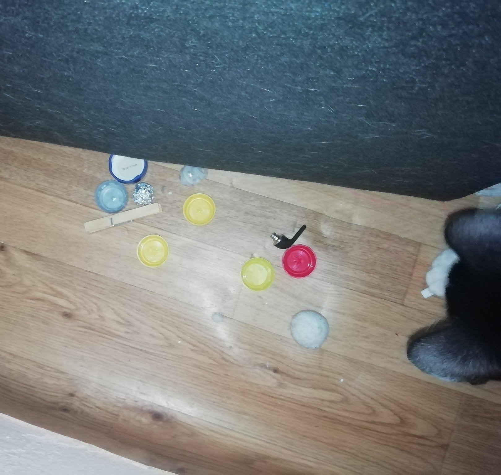 Моят се радва на капачки от минерална вода,лимонади на Куинс и вилички и лъжици от заведенията за бързо хранене.Носи ги,гони ги,голяма игра пада.