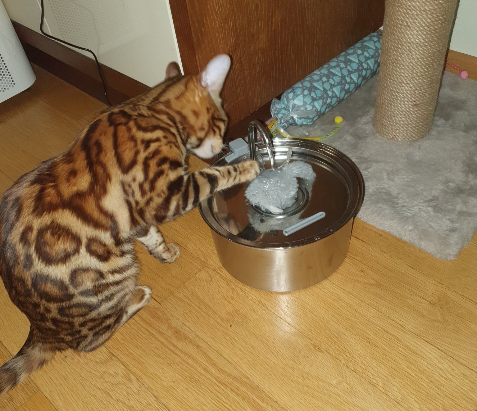 След пикането ѝ в купичката за вода взехме фонтан, ма то си е като чешмичка, не знам защо се водят фонтани. Пие от него рядко, за сметка на това ходи и си топи играчките - мартеници, плюшените ѝ мишки, пантофи, които постоянно разнася и хапе Simple Smile