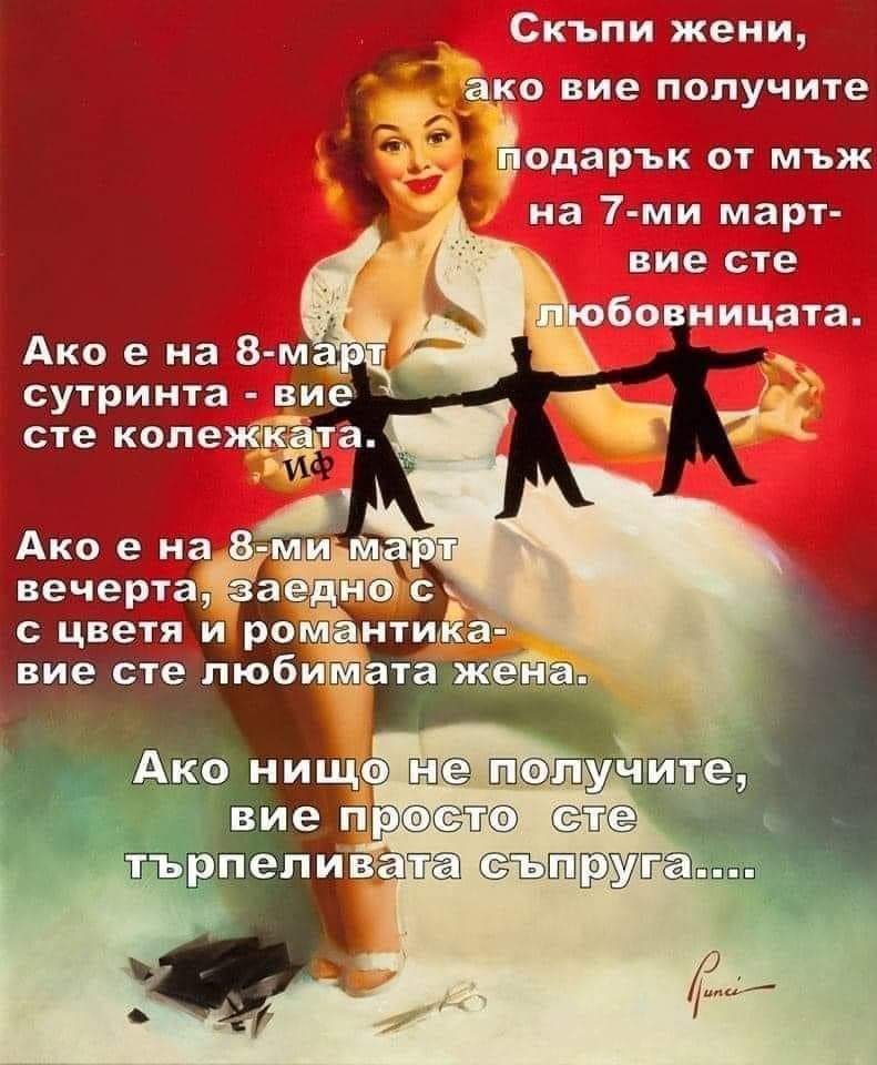Снощи зачетох (поредното) послание от жена към дамите. Нямало нищо женско в женския празник, но все пак - да се поздравим. Не знам дали и това не влияе (под)съзнателно на мъжете и се държат дръпнато  в семейната единица, щото няма как иначе да изразят недоволство от войнстващата “женственост”.