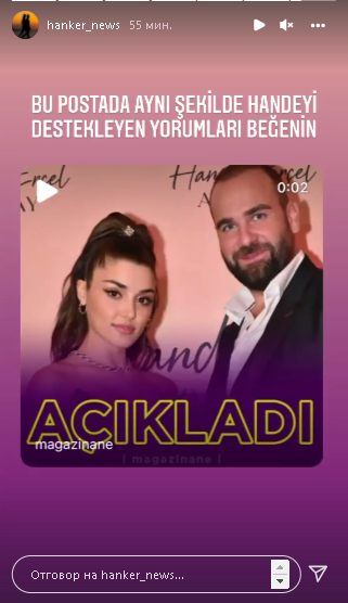 „Здравейте приятели. Вече два месеца се говори за това заедно ли са Ханде и Керем. Официална информация няма -нито от двойката, нито от агентите им. За вас събрах на едно място всичките предполагаеми причини за раздялата на най-обичаната двойка в последно време, които се разпространяват през последната седмица в мрежата: