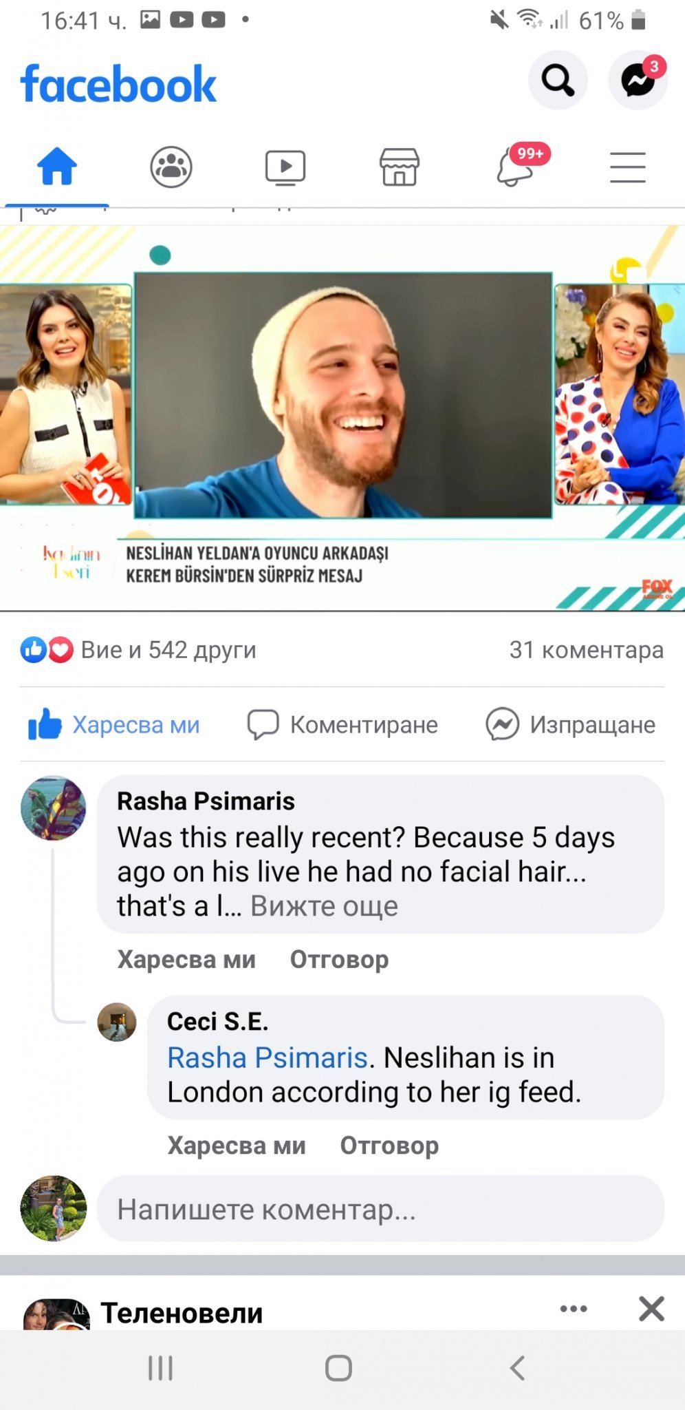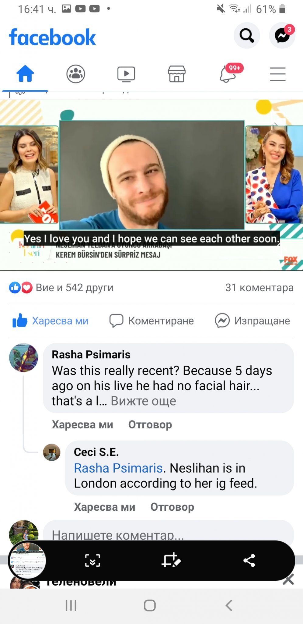 Това с търсенето на "улики" ,че Керем и Ханде не са се разделили вече минава границите на нормалното (то отдавна ги мина, ама нейсе), и върви към болестно състояние у част от феновете. Все едно па светът започна и свършва с ХанКер. Малко на преиграване ми върви вече..