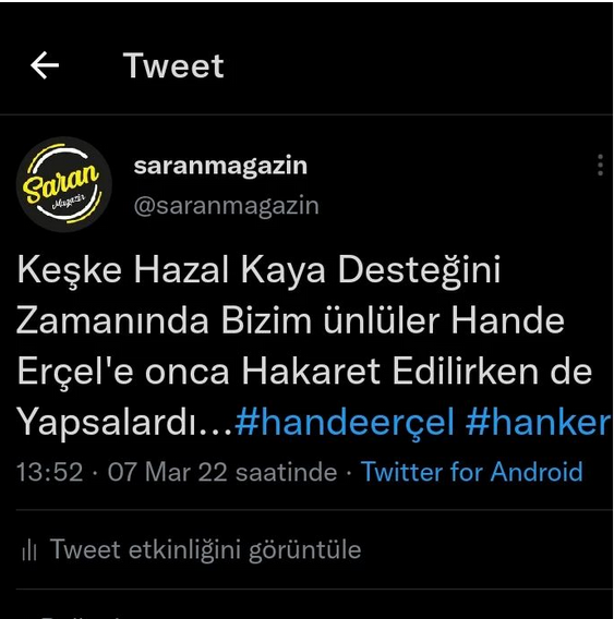 Всъщност никой не е писал че Хазал Кая е трябвало навремето да подкрепи Ханде, предполагам когато онзи пишман папарак я беше нарекъл някак си. Не съм я следяла тогава, не знам имало ли е, нямало ли е подкрепа. Но Керем в онзи случай на награждаването доста лица от Шоубизнеса го бяха подкрепили.