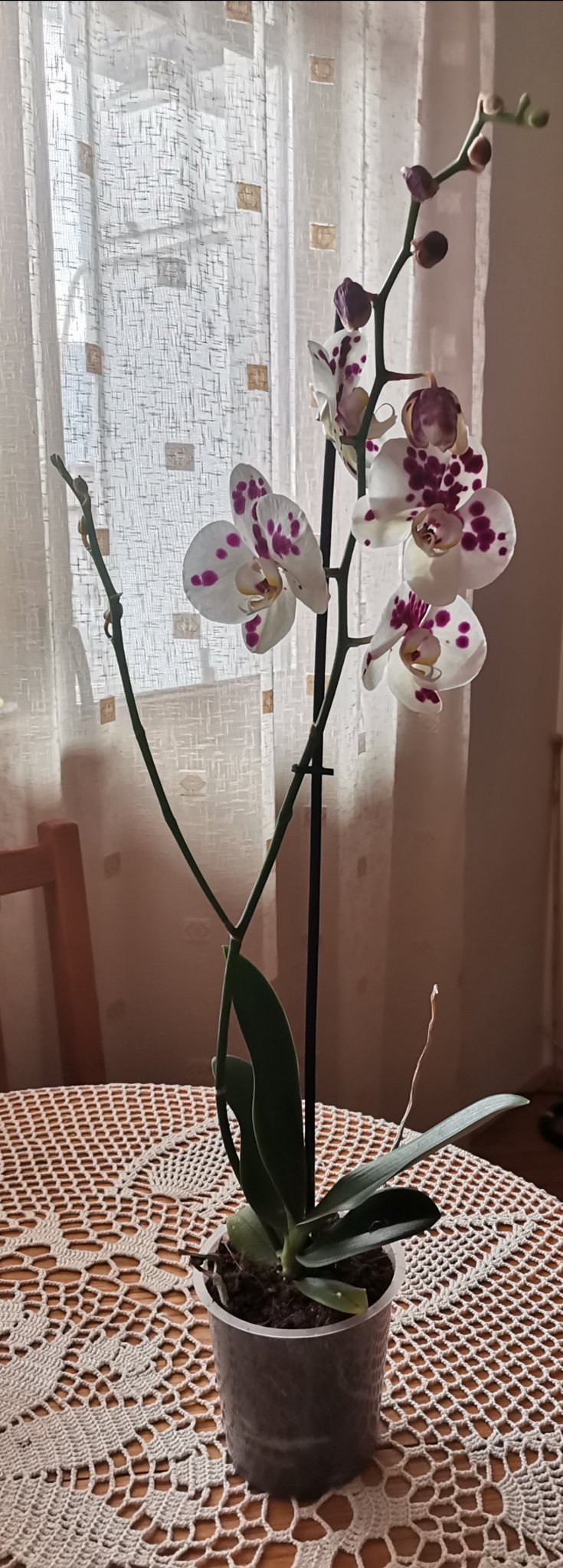 Fortuna, нормално е при промяна на местоположението и микроклимата да засуши пъпки. Тях можеш да ги махнеш. Като прецъфти, обезателно я извади от субстрата да видиш дали е с така наречената "тапа", която се маха внимателно и да видиш състоянието на корените. За момента ѝ се порадвай на цветовете.