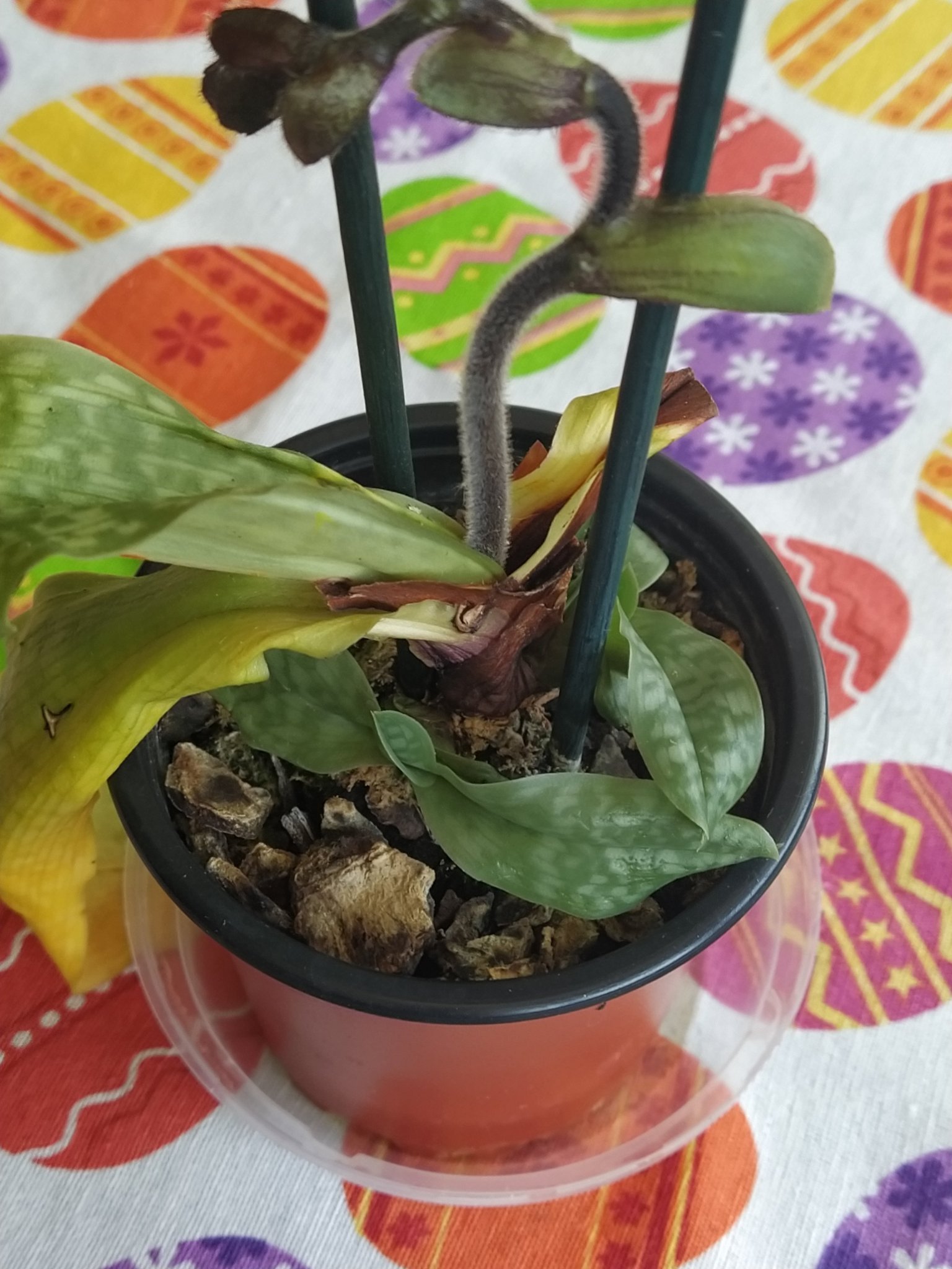 Субстратът изобщо не ми се струва подходяш, прекалено едър изглежда. Извади го, махни най- едрите парчета (горе-долу половината обем) и допълни с кокосови влакна, сфагнум ако имаш, и дребни камъчета. Това е земна орхидея, корените не искат въздух!