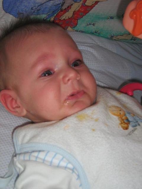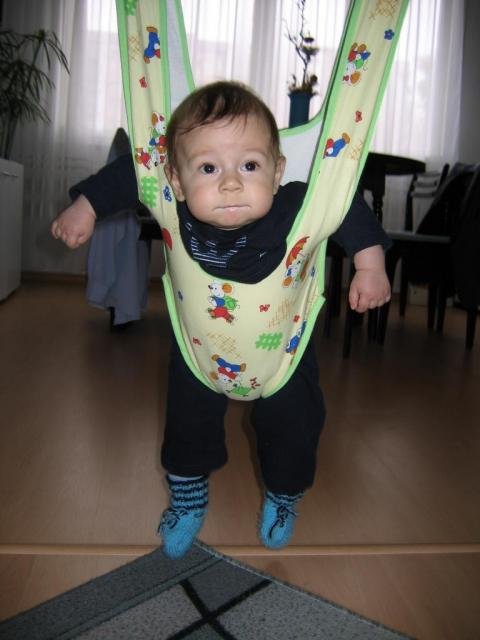 Аз да ви се оплача. Малкият беше миналата седмица хремав, сега аз съм болна. Главата ме боли, хремата е ужасна и оттова не мога да се наспя и се притеснявам да не го заразя милото. Но  стига съм се оплаквала, ето ви 2 пресни снимчици от нас. Вчера тествахме бънджи-гащите. Естествено сега основно се ползват за люлка и аз го поклащам надолу-нагоре, защото ни е рано крачетата да опират в пода. На първата се чудеше къде ли съм го напъхала, но после се осефери и почна да се кефи. Голямо удобство е, поне сега не е постоянно на ръчички  Simple Smile