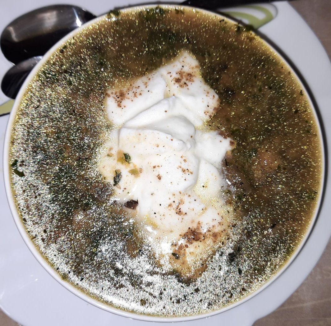 Вечерях няколко резенчета свинско филе и голяма купа със супа от коприва, кейл, гъби, моркови, целина (от глава), лук, зелен лук, червена чушка. Със застройка от 2 яйца и половин кофичка кисело мляко /не си личи на вид обаче/. Съжалявам, че толкова ужасно изглежда на снимка🤔🤔, но беше много вкусно!