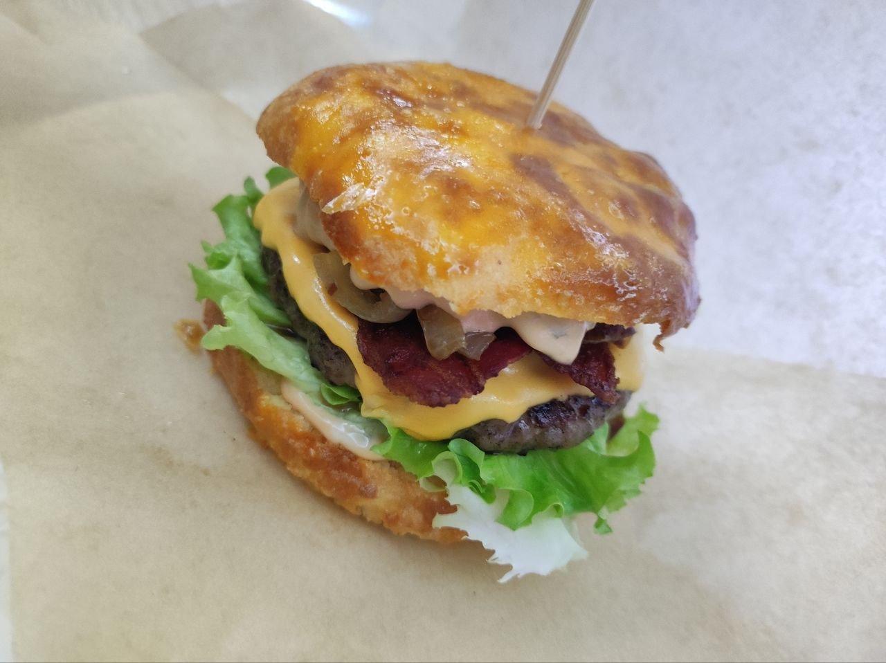 Искам да отбележа, че моето лично мнение е, че няма проблем да се хапне нещо "по-така" веднъж в седмицата, ако останалите хранения са стегнати и режимни. Бургерът е с фетхед тесто, телешки бургер от Лидл, листче чедър, запечен бекон, зелена салата, домашен карамелизиран лук без добавена захар, и сос от купешки майонеза, кетчуп и кисели краставички.