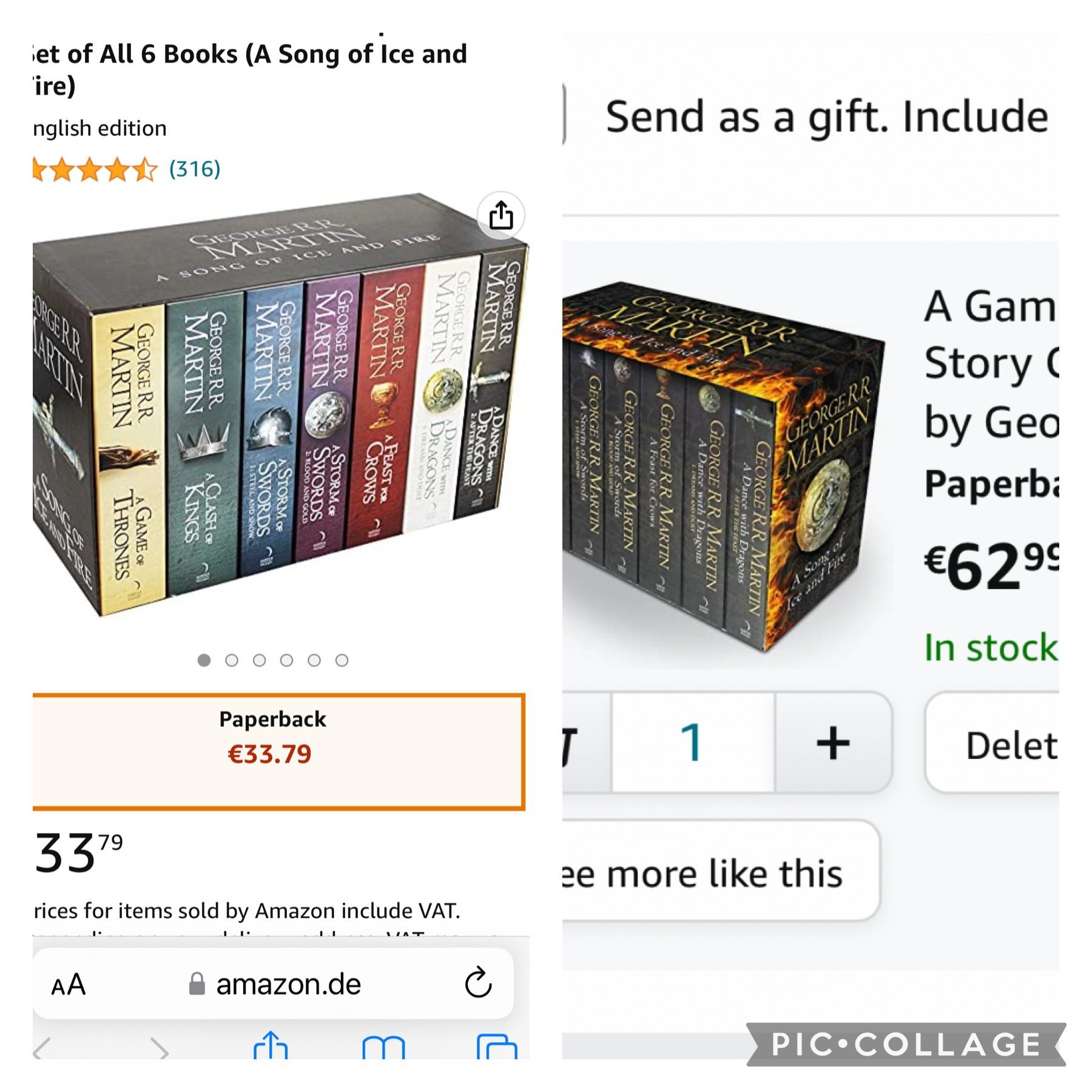 Няма разлика така като гледам между двете показани горе за Игра на тронове. Третата и Петата книга са ги разделили на две книги.