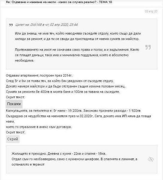 /500лв неотложен ремон теч+2X320лв (споразумение за неплащане на наем поради ИП м.март и м.април 2020г)+1 200лв затваряне на балкон с PVC дограма)/