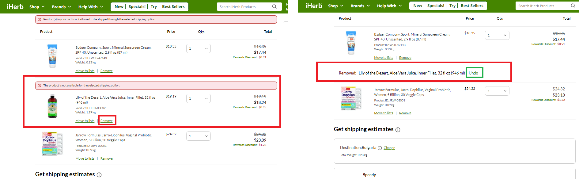 iHerb предлага доставка със Speedy и DPD, като всички данъци (ДДС) и такси са включени предварително. При получаване на пратката не се начисляват допълнителни разходи. Пратките се доставят чрез Speedy до посочения адрес. След изпращане на пратката получавате номер за проследяване (тракинг номер), чрез който можете да я проследите. iHerb предлага два метода за доставка: DPD и Speedy. При доставка с DPD пратката се изпраща от САЩ до Asendia USA, след което се доставя до DPD в Европа (напр. Германия), където се доставя до България чрез Speedy. Този метод включва преминаване през митница в Германия. При доставка със Speedy пратката се изпраща от САЩ до Meest в Нидерландията, преминава през Унгария и след това се доставя до България чрез Speedy. Този метод включва преминава през митница в Нидерландия. Важно е да наблюдавате проследяването на пратката, тъй като методите за доставка и митническите процедури могат да варират в зависимост от избрания метод и дестинацията на пратката.