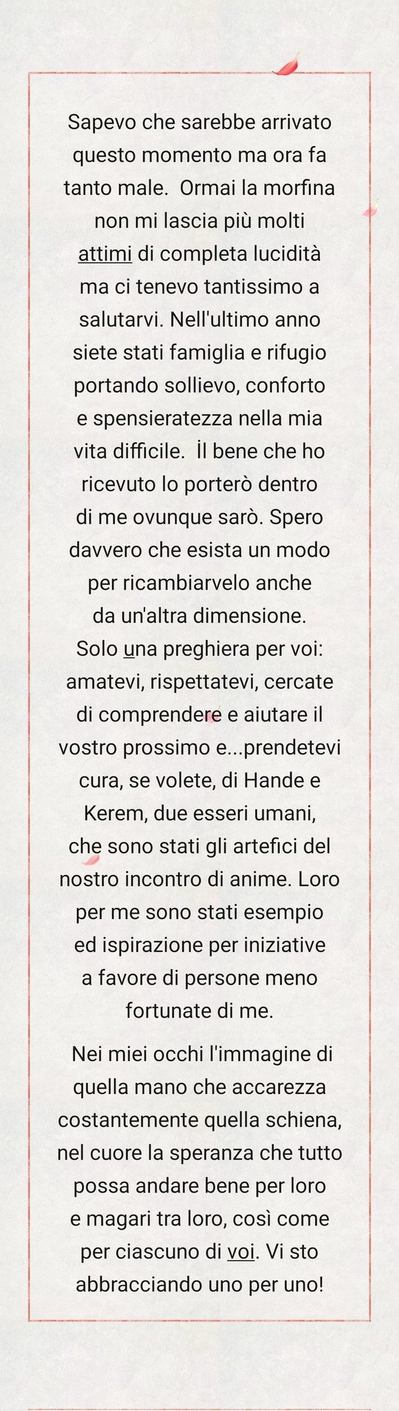 Знаех, че този момент ще дойде, но сега ме боли толкова много. Досега морфинът вече не ми оставя много моменти на пълна течност, но наистина исках да ви поздравя. През последната година вие бяхте моето семейство и убежище, носейки облекчение, утеха и лекота в трудния ми живот. Доброто, което получих, ще го нося в себе си, където и да съм. Силно се надявам да има начин да го отвърнем и от друго измерение. Само една молитва за вас: обичайте се, уважавайте ме, опитайте се да разберете и помогнете на ближния си и ... грижете се, ако искате, за Ханде и Керем, двама човешки същества, които бяха архитекти на нашите души. За мен те бяха пример и вдъхновение за инициативи в полза на хора с по-малко късмет от мен.