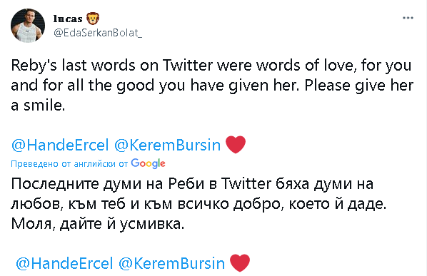 Феновете в Туитър разпространяват едно писмо написано от тежко болно момиче от рак на име Реби, до Ханде и Керем. Молят всички да го туитват и се обръщат към двамата да го прочетат.