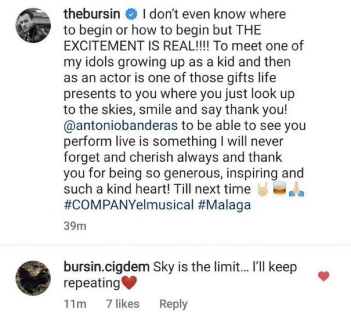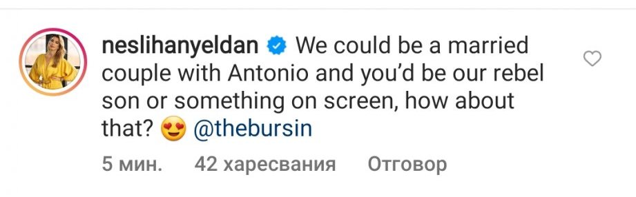 И един коментар под снимката с Антонио Бандерас - Мечтайте, поставяйте си цел, фокусирайте се върху целта,  постоянството и работата... И стига да не се откажете, получавате награда, скъпи Керем Бюрсин! Вие сте нарисували логото на продуцентската си компания докато сте в колежа, нали? Като актьор и продуцент сега сте на сцената с човека, на когото се възхищавате. Продължавай да сияеш, нека пътят ти е ясен винаги. Ние ти желаем късмет, и нека този късмет е винаги с теб. Вашето сърце е прекрасно.