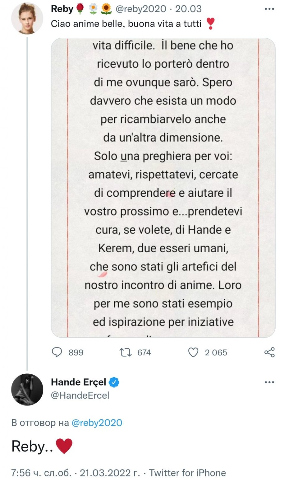 Ханде е написала коментар във връзка с писмото, което коментирахме снощи с Линдето. Както и вчера казах не знам какво е редно да коментираш в една такава ситуация. Писмото не беше насочено към Ханде и Керем, но се разпространи светкавично от феновете. Ханде е сложила просто иконка сърце, наистина няма подходящи думи в такава ситуация.