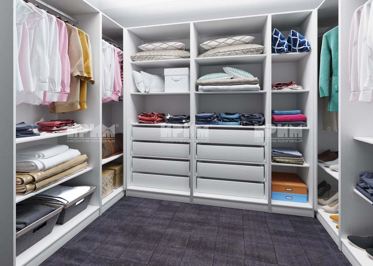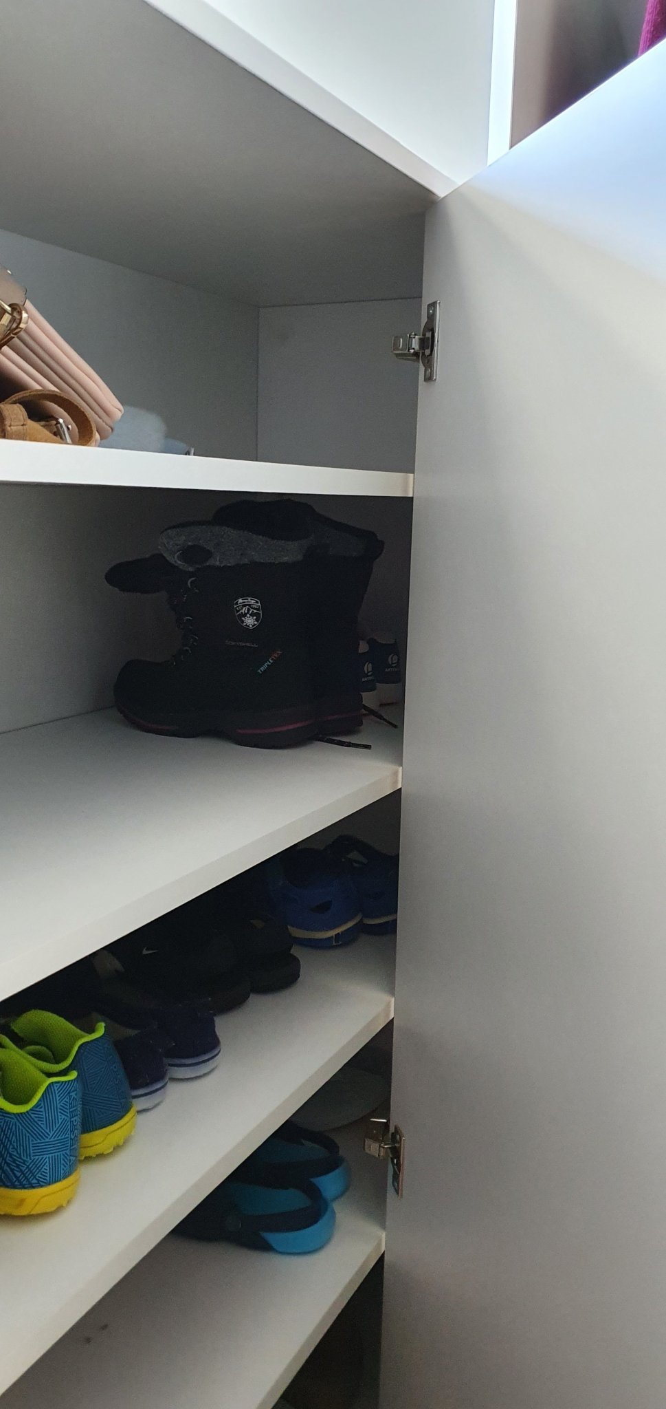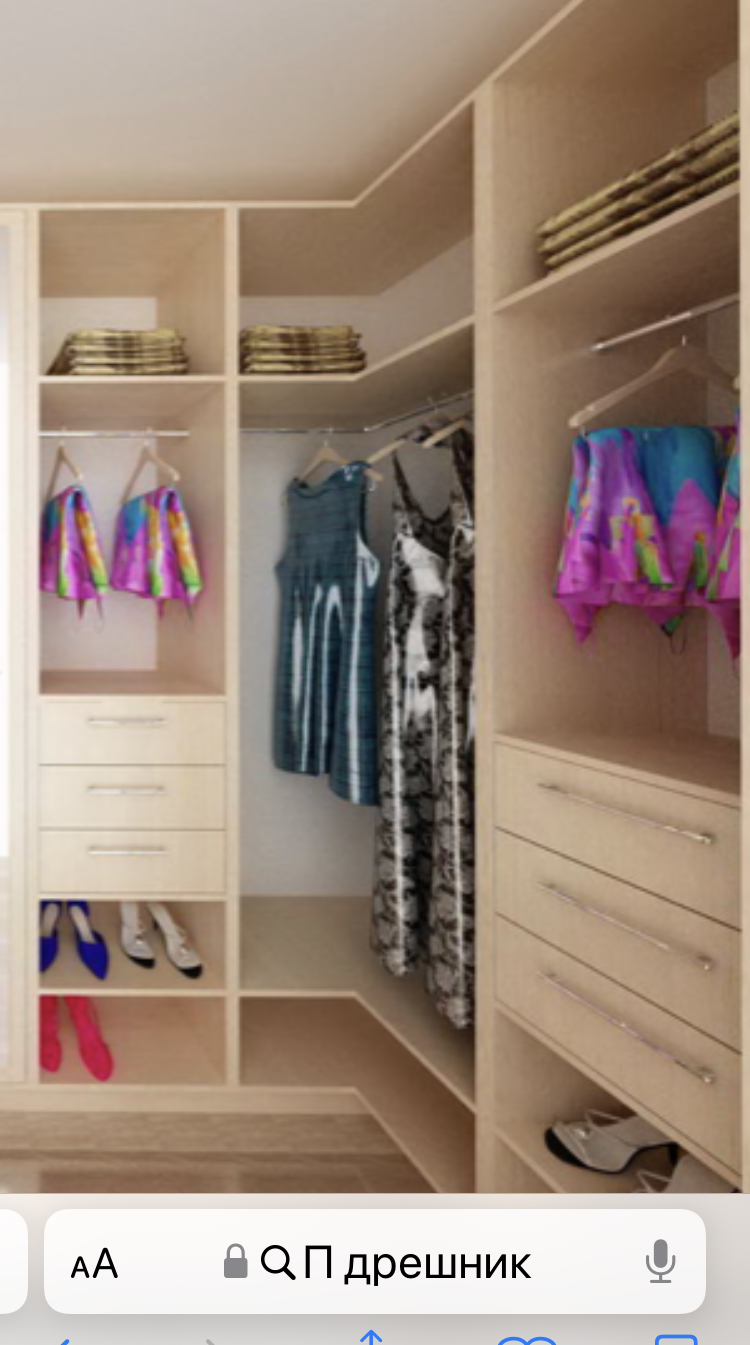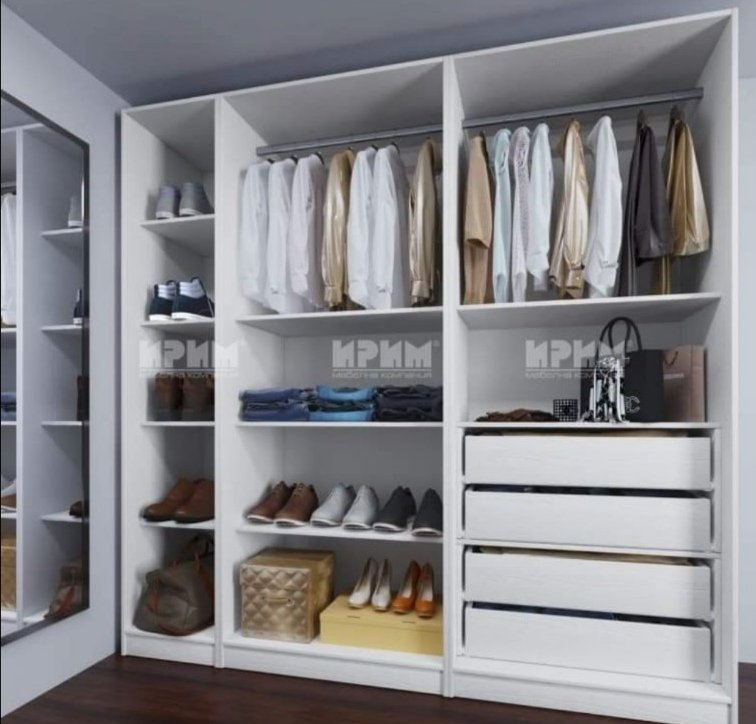 При мен гардеробното е с кардероби на двете срещуположни страни. Под лостовете имам две издърпващи се поставки ( чекмеджета без чела), където има обувки.