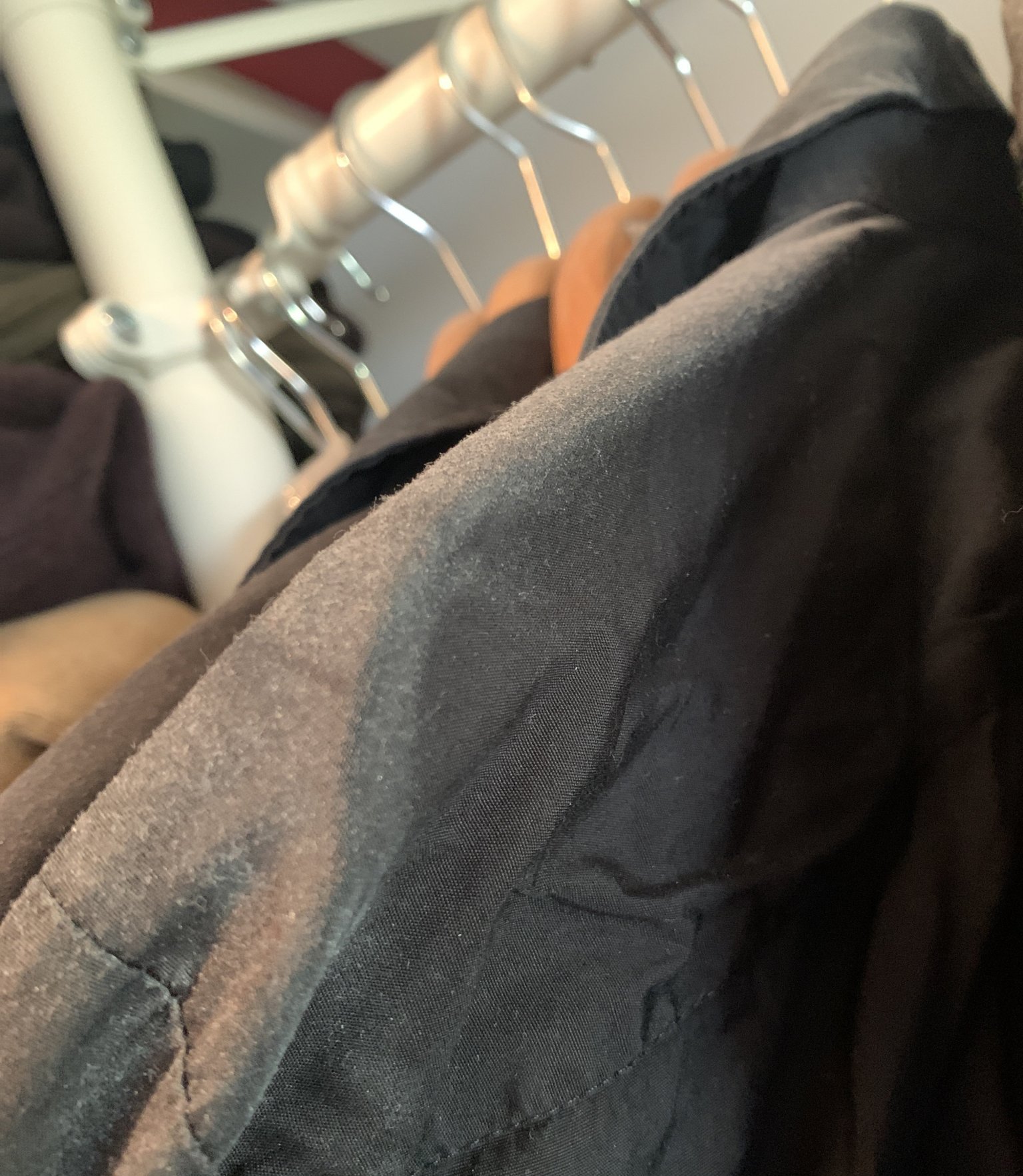 Черна риза на мъжа ми.На снимката изглежда сива чак…увеличих да се види прашолякът.Някои ризи не ги носи често и като се заседят се вижда колко прах има, макар да ги изтупвам периодично и да отваряме и прозореца  на дрешника.