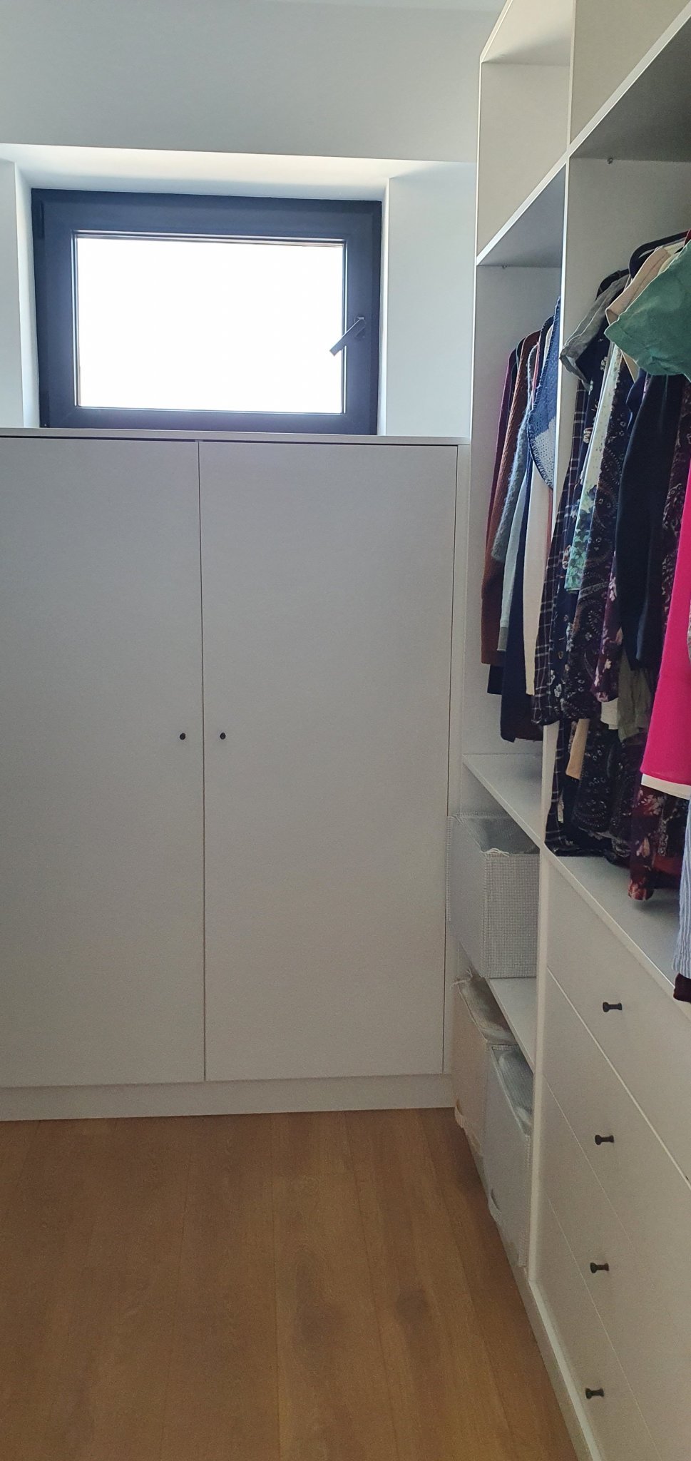 И аз съм манияк и отначало подреждах дрехите по цвят и дължина .След втората седмица ползване ,педантизмът в мен заговори ,че съм взела грешно решение и е трябвало да сложа врати ,за да не гледам шаренията .Година по-късно не ми пречи ,явно се променям  или фактът ,че е отделна стая е ключов .Отделно виждам всичко много по-добре и ми идват различни идеи за комбиниране , гледайки всички дрехи .Някак по-различно е когато всичко е зад врати.