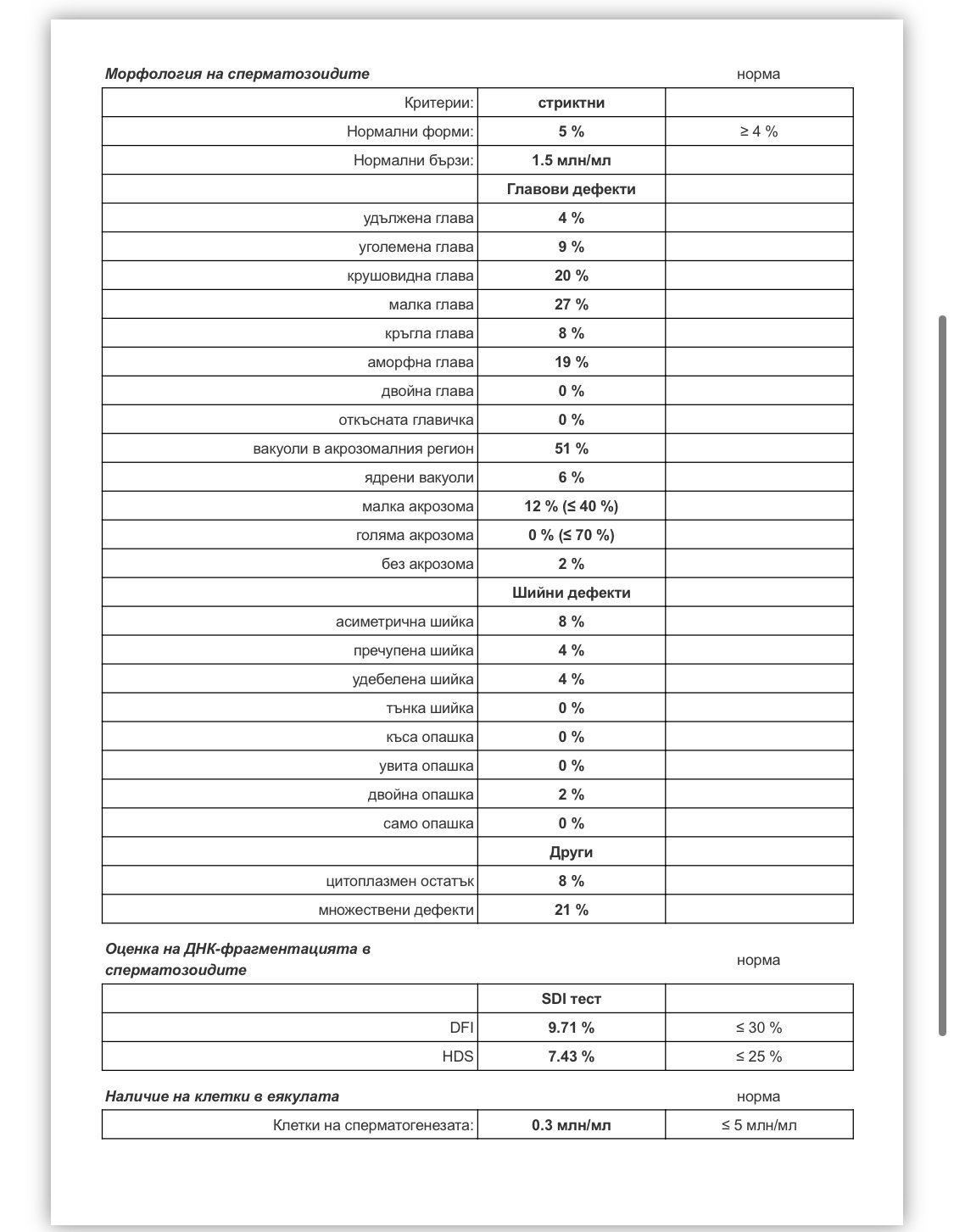 Видях коментара , но на морфология подточка нормални форми е само 5% , което не знам като процент дали е нормално . За първи път правим подобен вид изследване , ще съм благодарна на ваш коментар , какво можем още да подобрим и как . 🙂
