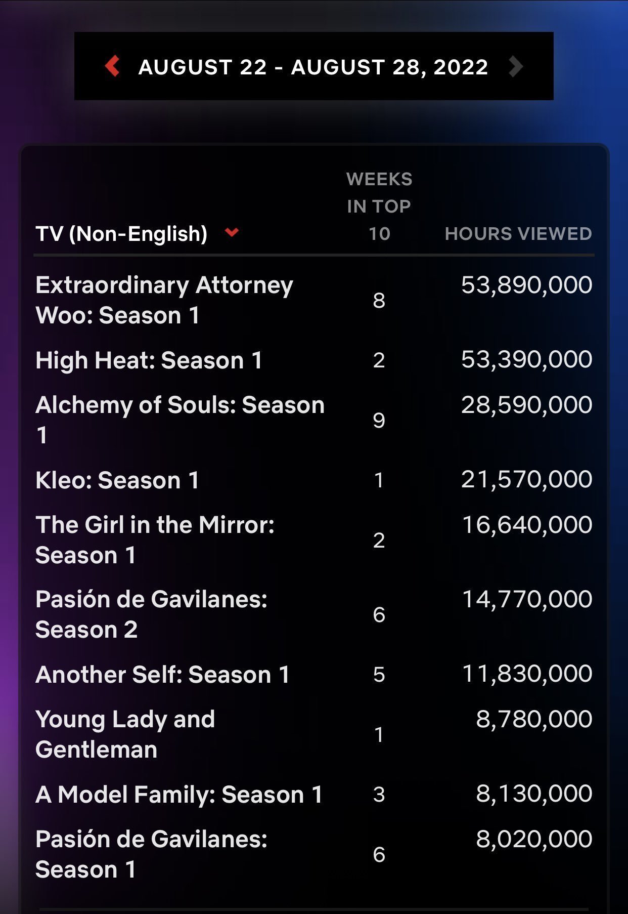 "Оливковое дерево", которое смотрели 18 100 000 часов в первые 4 дня, 31 200 000 часов во вторую неделю, 21 990 000 часов в третью неделю и 17 300 000 часов в четвертую неделю. Общее количество просмотров сериала за 32 дня достигло 100 420 000 часов.