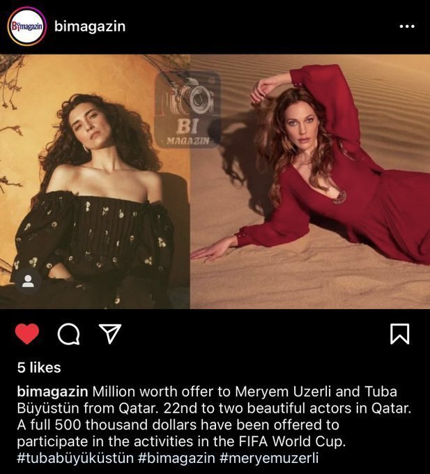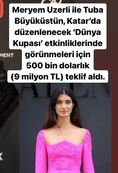 Предложение Тубе Бюйюкюстюн и Мерьем Узерли принять участие в 22-м чемпионате мира по футболу. Предложили 500 тысяч долларов за участие в мероприятиях чемпионата мира по футболу, который будет проходить в Катаре с 21 ноября по 18 декабря 2022 года. Начался обратный отсчет до 22-го чемпионата мира по футболу. Многим известным именам из Турции также были сделаны предложения по великолепной организации, в которой пройдут мероприятия с участием всемирно известных имен. По слухам, среди этих имен Туба Бюйюкюстюн и Мерьем Узерли.