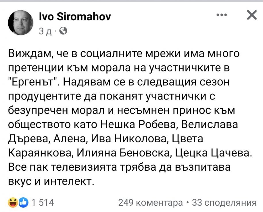 Колкото до Зорница - правилно ли разбирам, че всъщност дължи част от всеки хонорар, който спечели покрай предаването Ергенът на БТВ? Ако е така, добре се ориентирала за своите цени - нито ще я канят излишно за да си чешат езиците с нея, или да я подиграват открито, нито ще си губи времето в глупости ✌️
