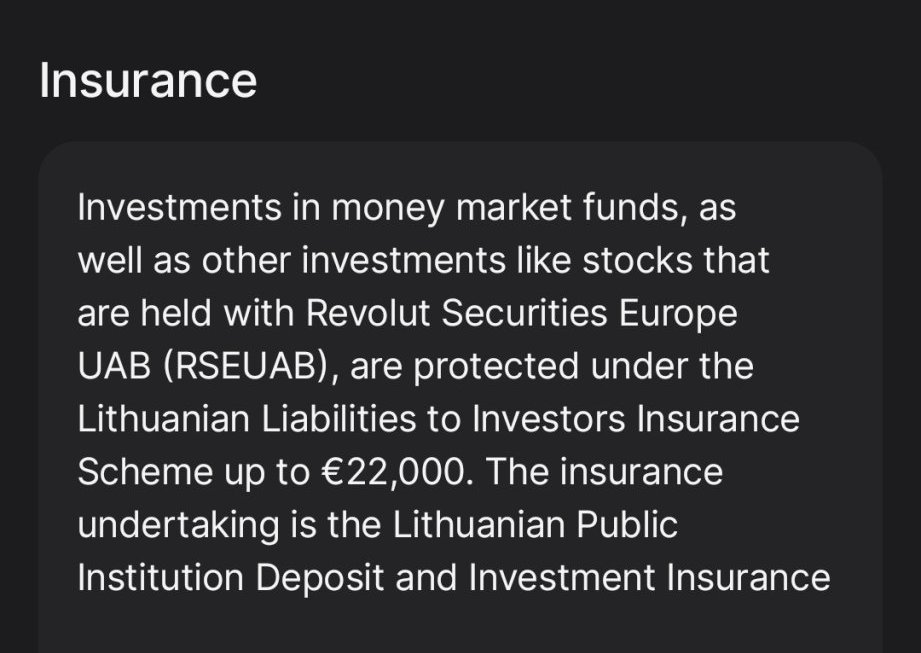 Инвестициите във фондове на паричния пазар, както и други инвестиции като акции, които се държат в Revolut Securities Europe UAB (RSEUAB), са защитени по Литовската схема за застраховане на инвеститори в размер до 22 000 евро. Застрахователното предприятие е литовската публична институция."