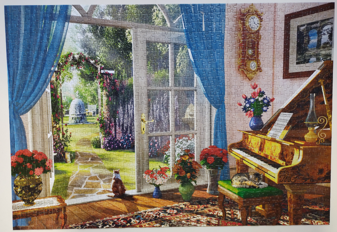От тези три парчета,средното със сигурност не е от пъзела.Третото обаче ми се струва,че може да бъде от саксията,която е на стълбите.Първото може ли да е от рамката горе?Или изобщо не е от пъзела.