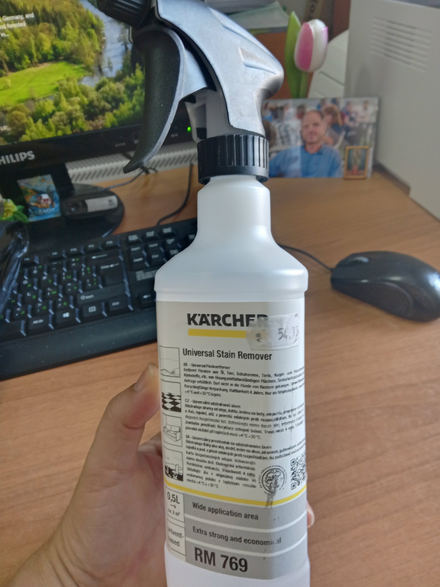 Добро утро, искам този препарат за петна да ви покажа, на Керхер. Скъп е, около 50 лв. и е тежката артилерия, но сработи за петна от борова смола върху ленен панталон и памучна рокля. Изби си парите на първите две петна, две три напръсквания. Не промени цветовете на дрехите.
