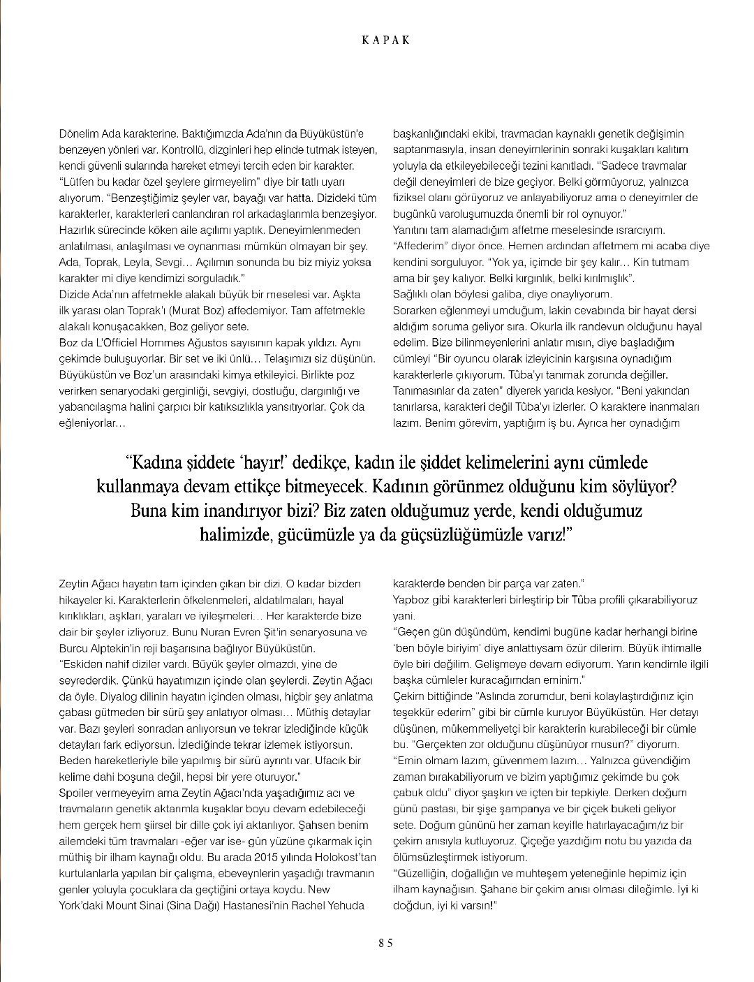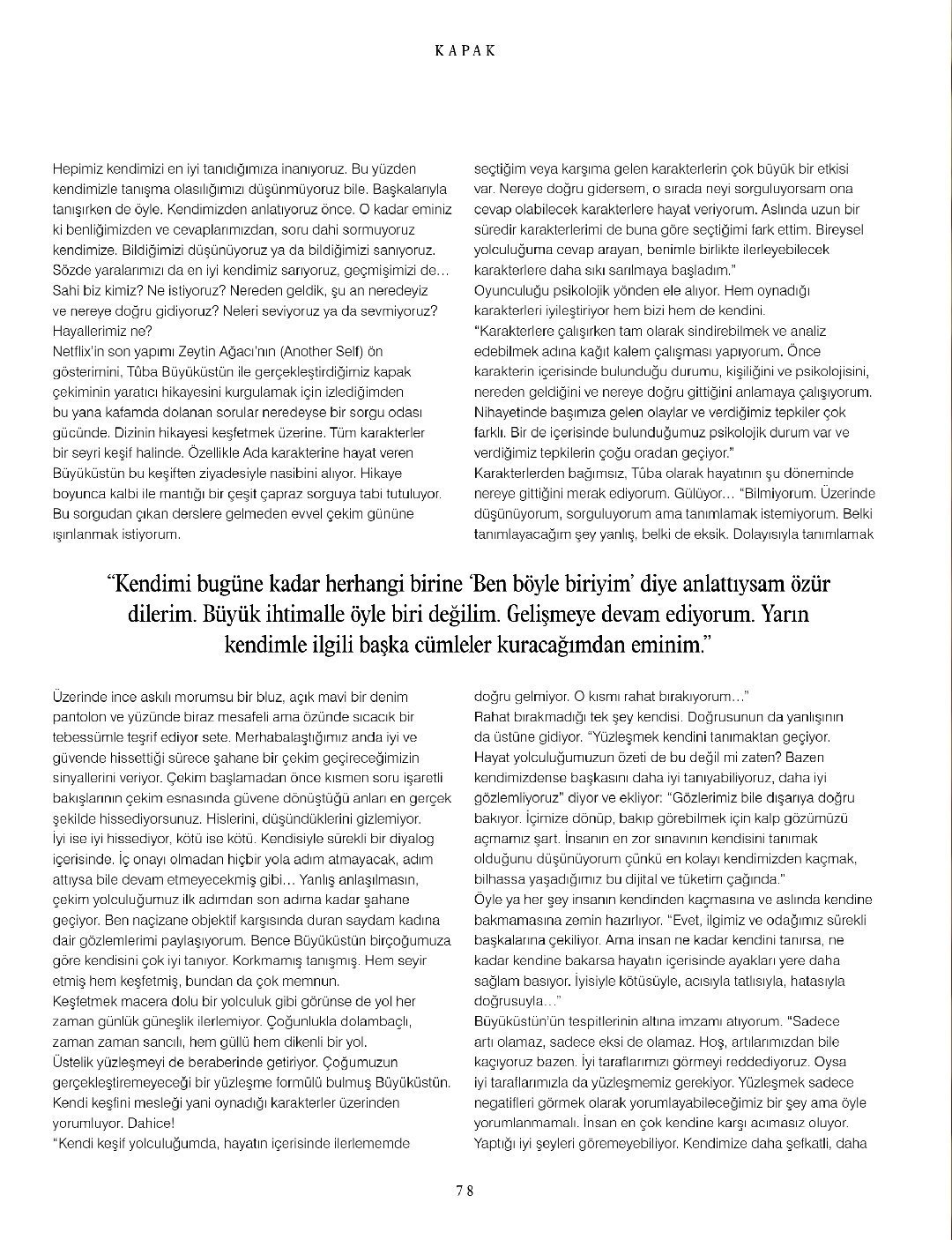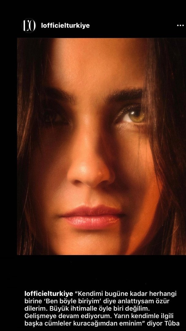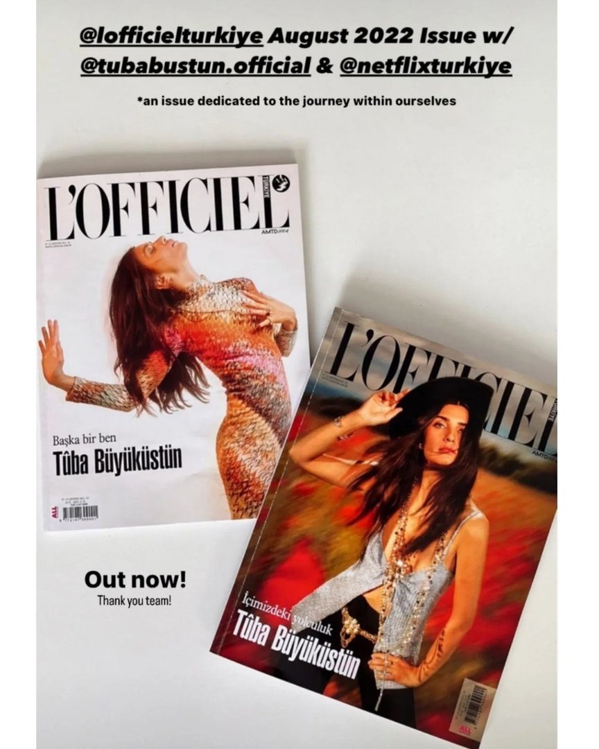 Историята зад най-новата продукция на @netflixturkiye на ''The Olive Tree/МД'', ''The Other Me/ДА'', е свързана изцяло с открития. Всички герои са в състояние на изследване. По-специално Туба Бююкюстюн, която е родила героинята Ада, извлича много от това откритие. Брой на списание L'Officiel, Турция, август 2022 г.