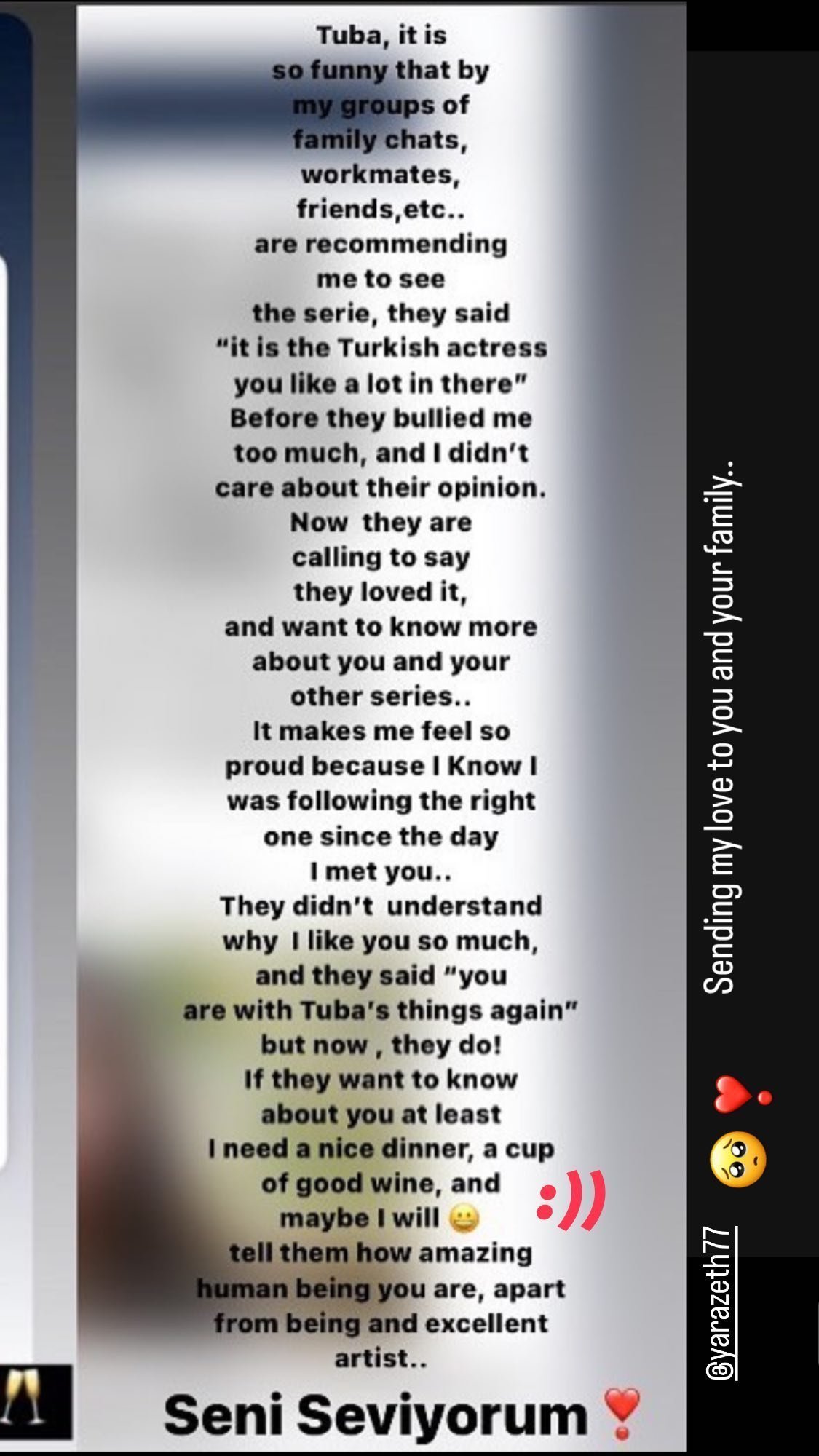 1.Туба, толкова е смешно, че моите семейни чат групи, колеги от работа, приятели и т.н. препоръчват ми да гледам сериала, казват: "Има една турска актриса, която много харесваш." Преди това много ми се подиграваха, но не ме интересуваше мнението им. Сега ми се обаждат, че и на тях им е харесало и искат да разберат повече за вас и другите ви предавания..Това ме кара да се чувствам толкова горда, защото знаех, че следвам правилния път от деня, в който те опознах. Те не разбраха защо те харесвам толкова много и казаха: „Ти пак нещо за Туба“, но сега ме разбират! Ако искат да научат повече за теб, поне имам нужда от добра вечеря, чаша хубаво вино и може би ще им кажа какъв невероятен човек си, да не говорим, че си страхотна актриса..