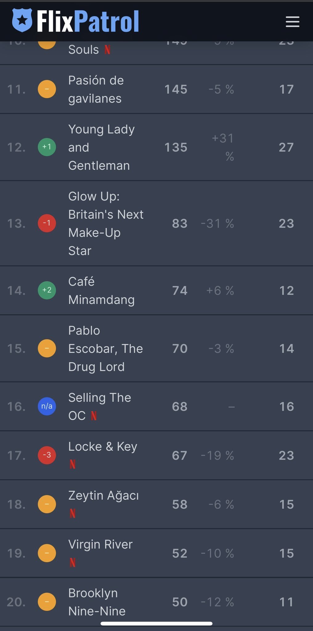 Туба не се е явявала тези дни. ДА още  е номер 1 в Турция и все още в топ 20 на Нетфликс.