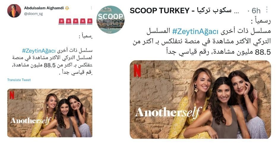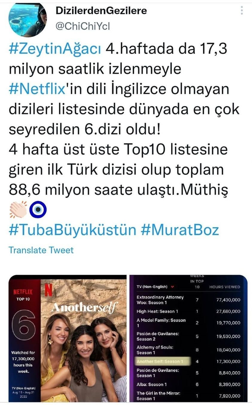 С участието на #TubaBüyüküstün #ZeytinAğacı, достигайки общо 88,5 милиона часа гледане, счупвайки рекорда сред турските продукции, излъчвани в #Netflix, беше 6-та сред 10-те най-гледани продукции на netflix неанглоезични продукции в своята 4-та поредна седмица.