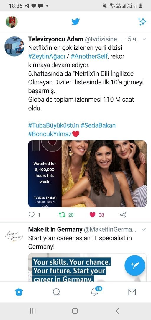 Another Self е на 78-ма позиция 🔥 в световните топ 100 английски и неанглийски телевизионни сериали на Netflix от юни 2021 г., NB: Това е единственият турски сериал в този списък. Туба е рекордьорът 💥 #TubaBüyüküstün #ZeytinAğacı #AnotherSelf